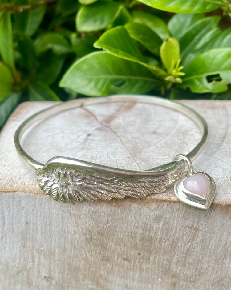 A heartfelt, symbolic piece made to honour love, guidance, and connection. Handcrafted from sterling and fine silver, this oval-shaped bangle features a textured finish, an angel wing, and a pink opal heart. This bangle would make a beautiful gift for someone you hold close, or a meaningful piece to wear for yourself.
