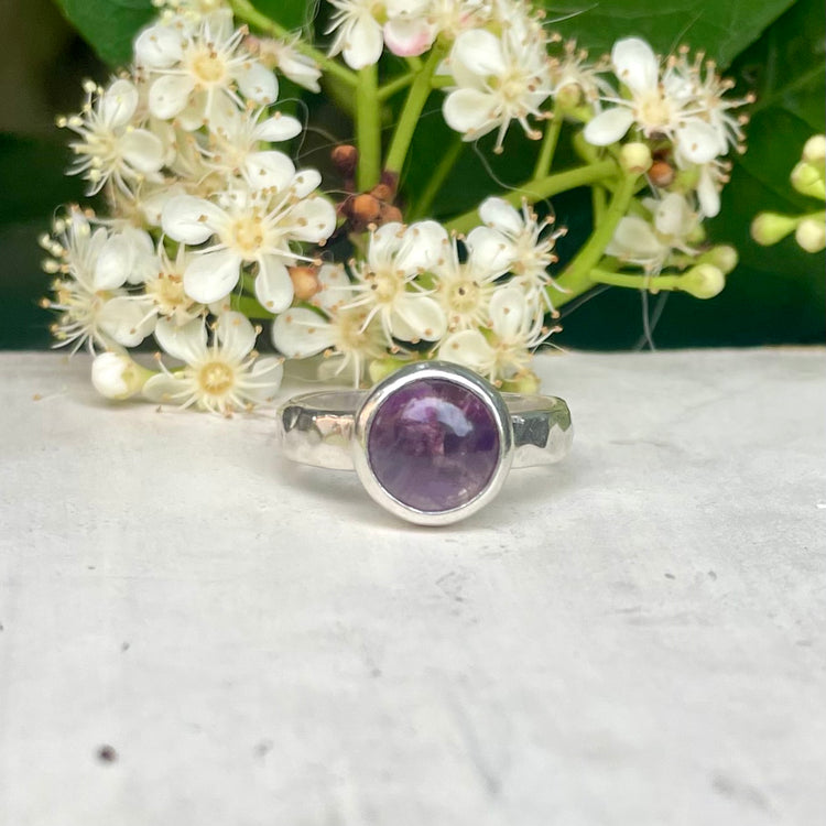 This beautiful deep purple Amethyst cabochon has been set in fine silver. The back of the setting has been left open to allow the light to shine through. The Amethyst sits upon a hammer textured sterling silver band.
