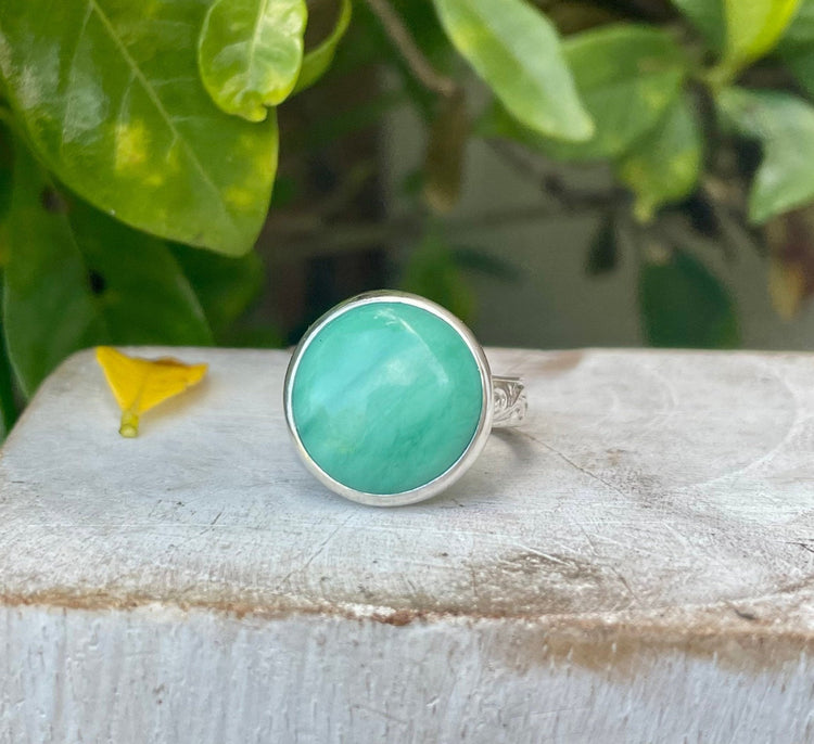 This piece was designed to showcase the natural beauty of the Australian Variscite, a grounding stone that symbolises hope. The mint-green Variscite has been set in fine and sterling silver. The patterned sterling silver band finishes this ring off perfectly.