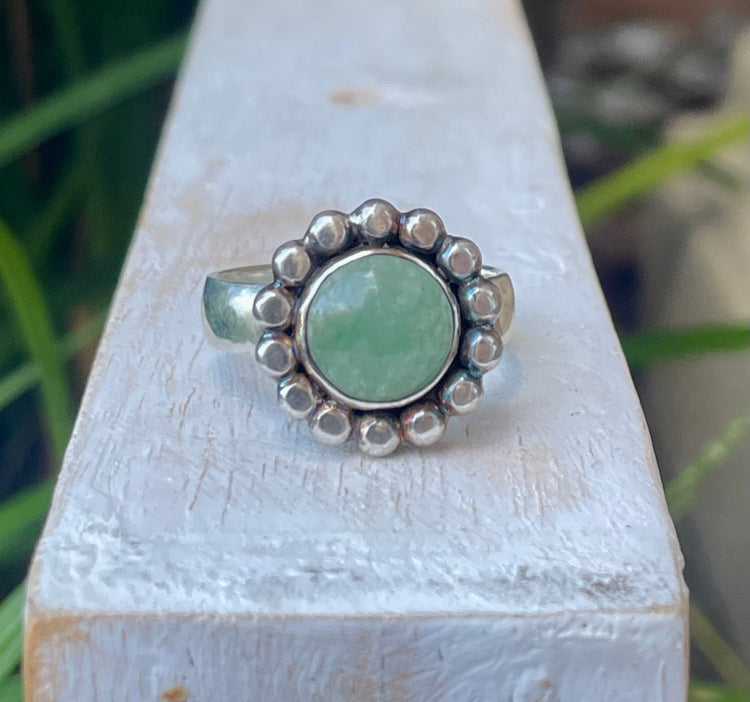 A lovely, soft green Aventurine cabochon forms the centre of this flower. The Aventurine is set in fine silver on a sterling silver backing plate. The back of the setting has been left open to allow the light to the light to shine through the stone. The Aventurine appears a lighter green when in the light. It is more opaque and such a lovely shade of green when worn. Sterling silver petals surround the Aventurine.