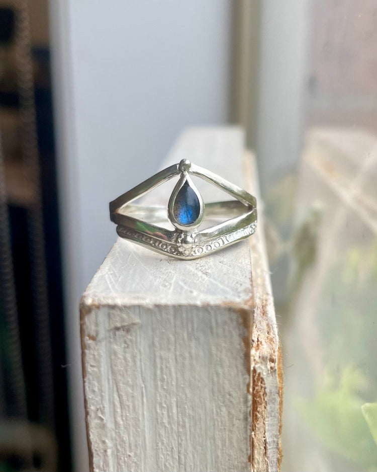 A luminous labradorite ring that shifts with the light – made to move with you.