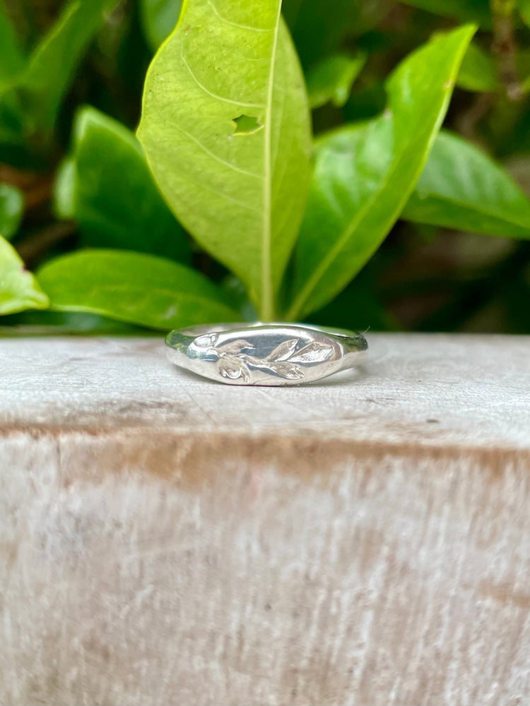 This handcrafted signet ring was made using the ancient process of lost wax carving, then cast in solid sterling silver. The face of the ring carries a delicate impression of a leaf and rose.