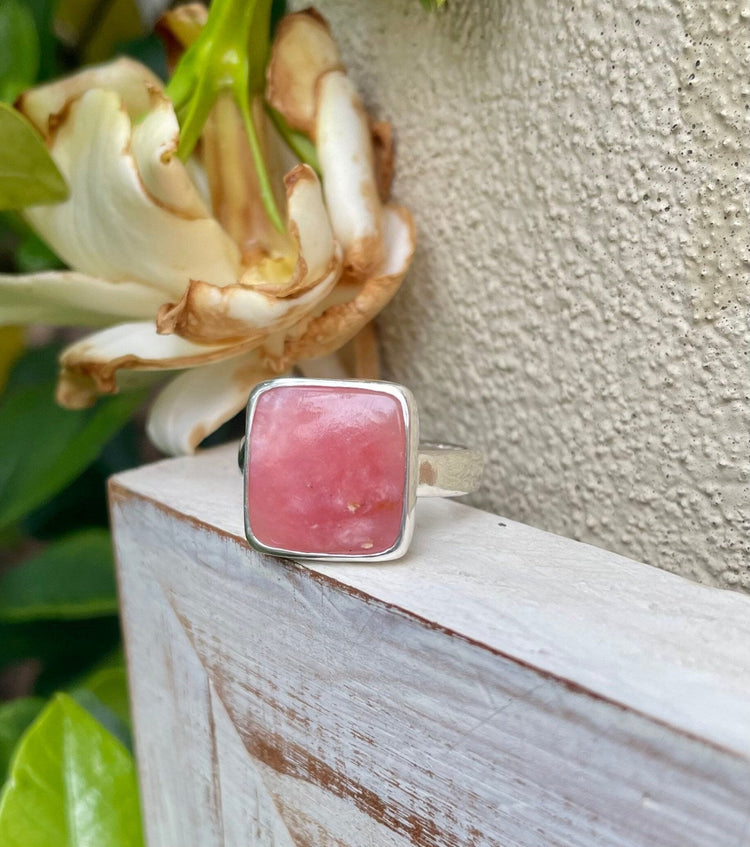 Square Rhodochrosite Statement Ring – Hammered Sterling Silver Band - Handmade Gemstone Jewellery