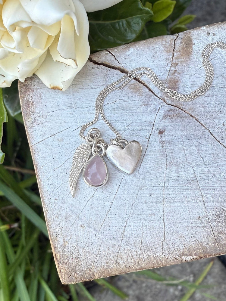 This handcrafted ‘Hearts and Angels’ Cluster Necklace is a heartfelt design featuring a soft pink rose quartz, a sterling silver heart, and a graceful sterling silver angel wing. Worn close to your heart, each charm carries symbolic meaning—love, connection, guidance, and protection.