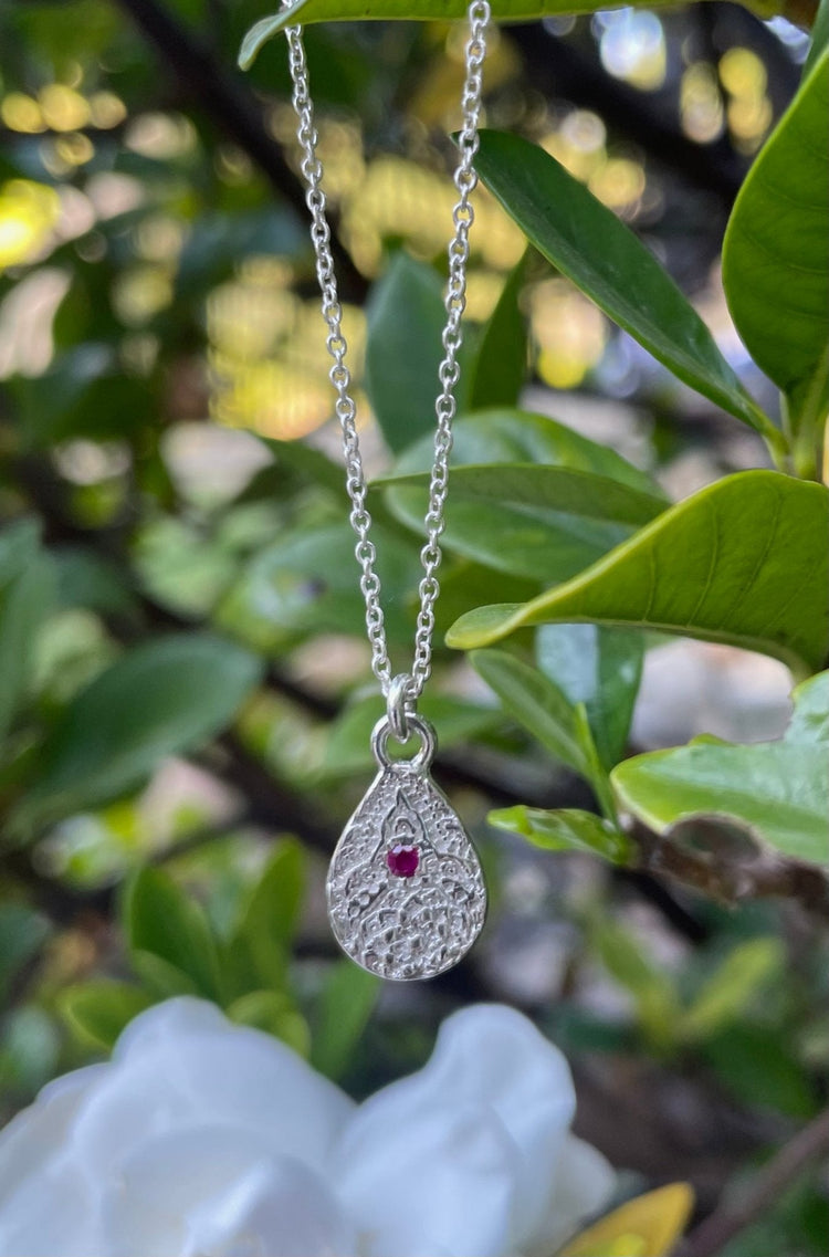 A sweet teardrop-shaped pendant, made from silver and embossed with an intricate pattern. A small faceted pink ruby has been set in the teardrop, catching the light as it moves. The pendant hangs from a 45cm sterling silver chain - simple, elegant, and easy to wear every day.